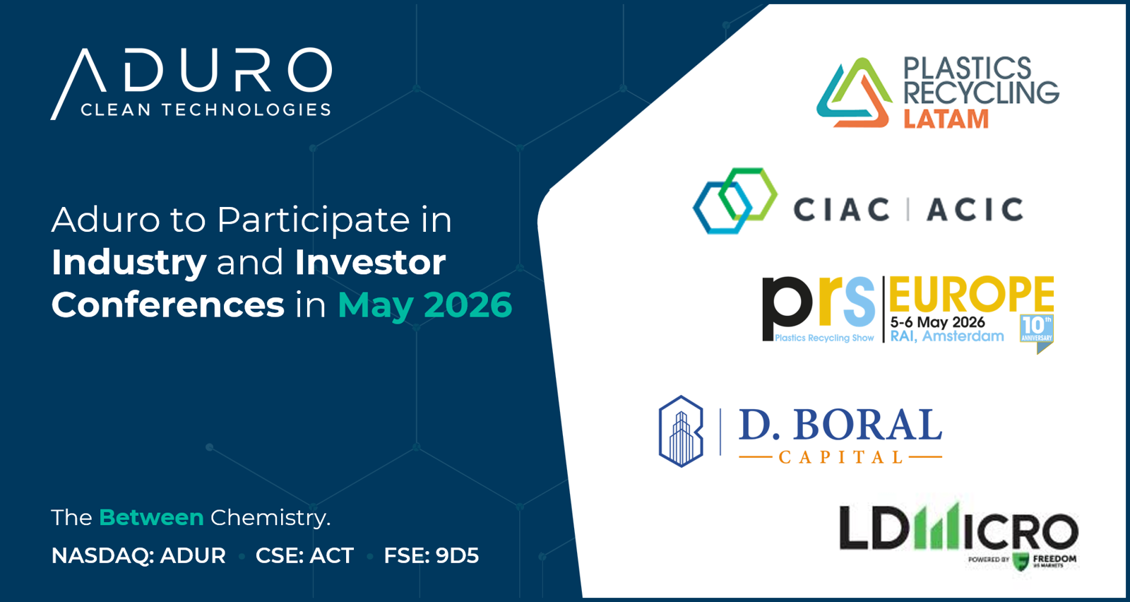 LONDON, Ontario, April 30, 2026 (GLOBE NEWSWIRE) — Aduro Clean Technologies Inc. (“Aduro” or the “Company”) (Nasdaq: ADUR) (CSE: ACT) (FSE: 9D5), a clean technology company using the power of chemistry to transform lower-value feedstocks, like waste plastics, heavy bitumen, and renewable oils, into resources for the 21st century, today announced its participation in several industry and investor conferences in May 2026.