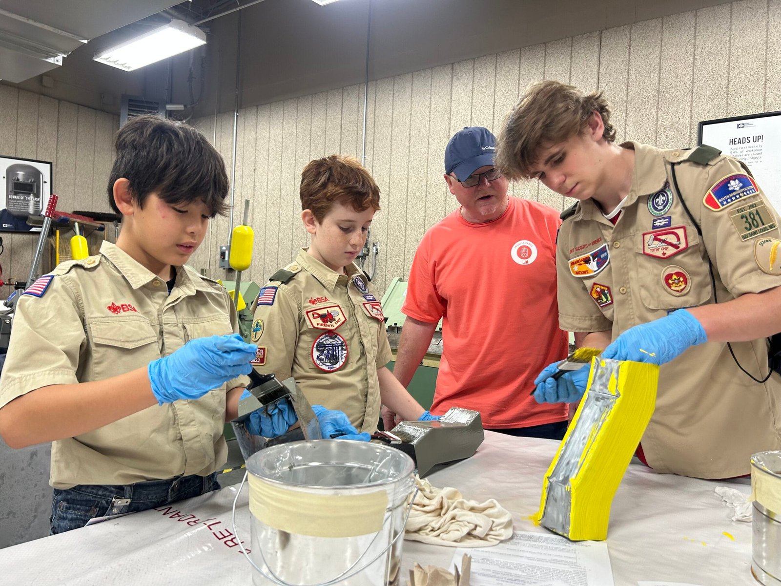 This year, Scouts selected from nine different merit badge courses — communications, electricity, electronics, engineering, fire safety, first aid, painting, personal management, and plumbing — earning two merit badges by the end of the day. The event was led by Ingalls Shipbuilding employees, many of whom are former Scouts or active Scout leaders, who guided participants through activities in their chosen areas of interest.