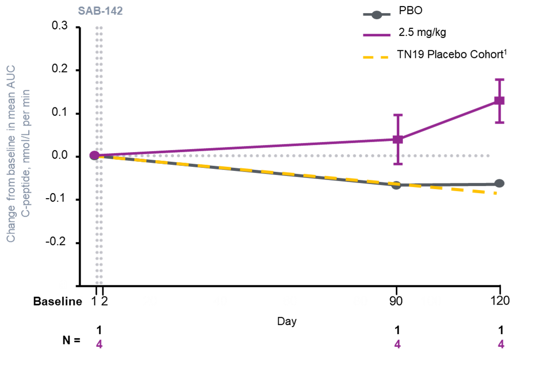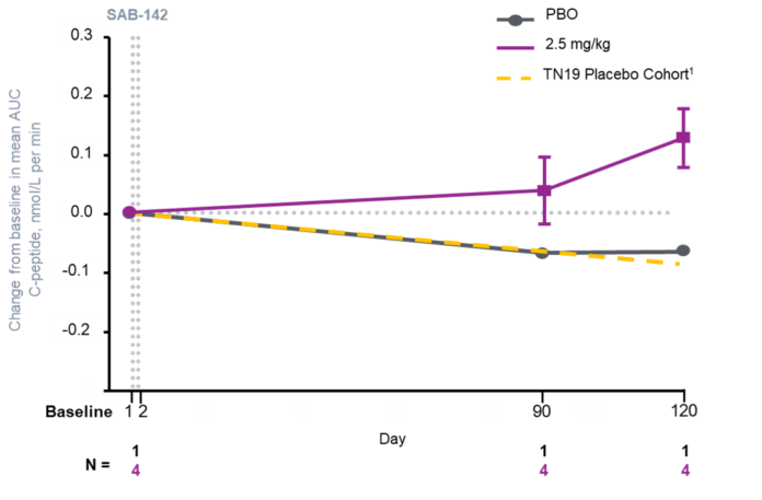 Participants treated with SAB-142 (2.5 mg/kg) demonstrated preservation in C-peptide levels compared to baseline with mean values increasing above baseline by Day 120. In contrast, the placebo-treated participant showed a decline in C-peptide consistent with the predicted rate of disease progression. For reference, the TN19 Placebo Cohort1 is modeled using a historical C-peptide trajectory based on historical placebo arm from the TN19 study1. By Day 120, participants receiving SAB-142 show divergence from both the study’s placebo-treated participant and the TN19 modeled placebo cohort, supporting a PD effect consistent with the preservation of beta cell function in adult patients with established T1D.