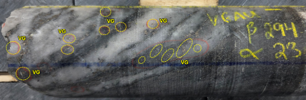 - Hole RLG-25-187 Intersected Vein 013 with 1m @ 28.5 g/t Au, from 116.25m to 117.25m. This high-grade intercept was complimented by visible gold spatially associated with quartz veining and strong silicification (Figure 3).